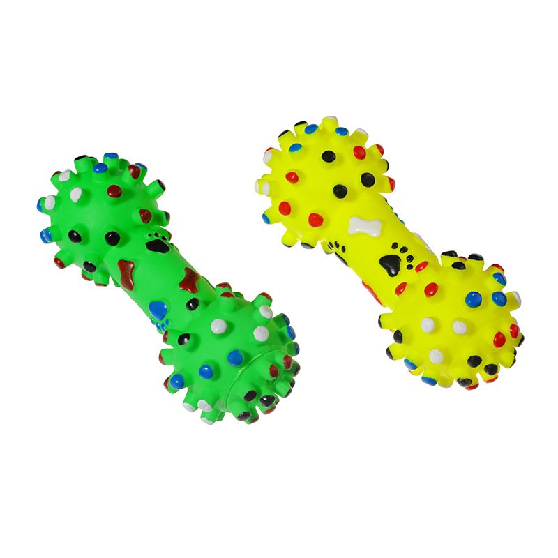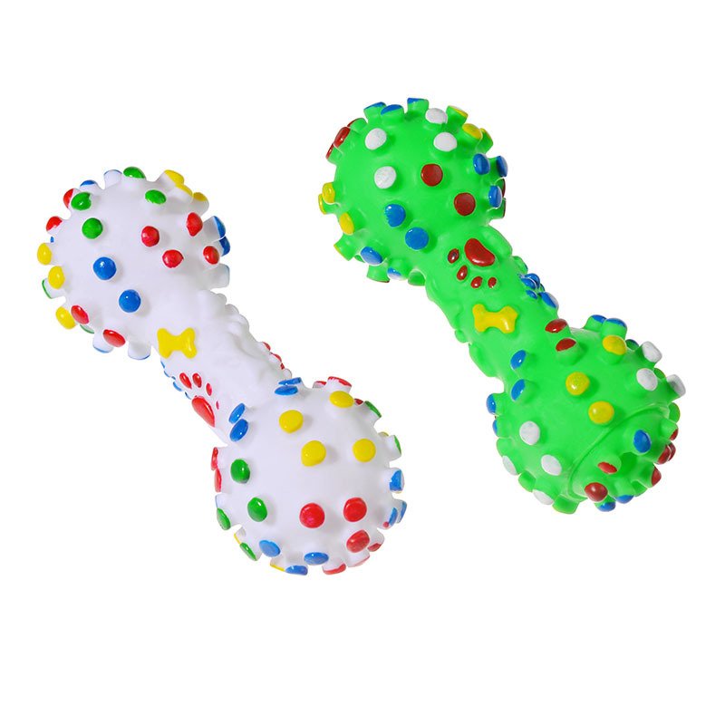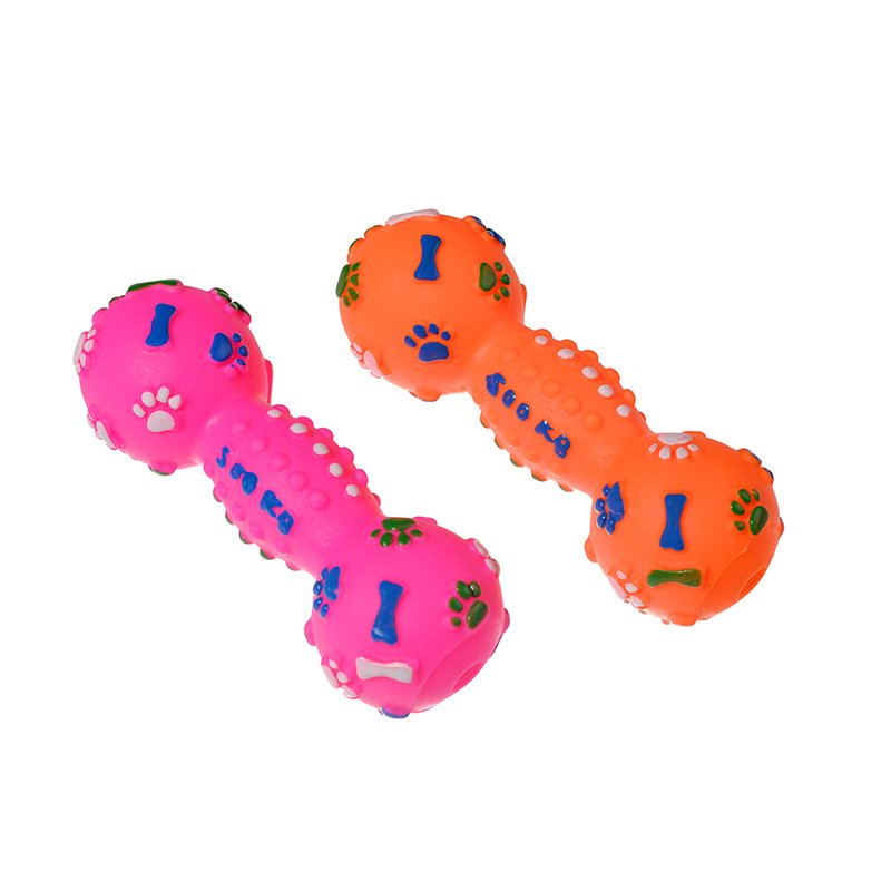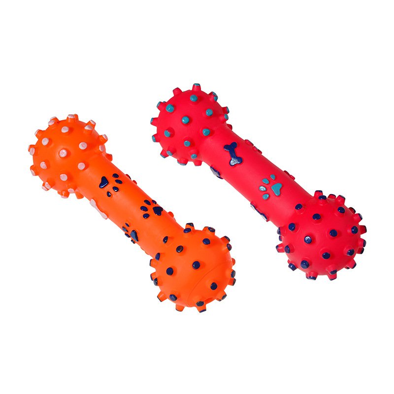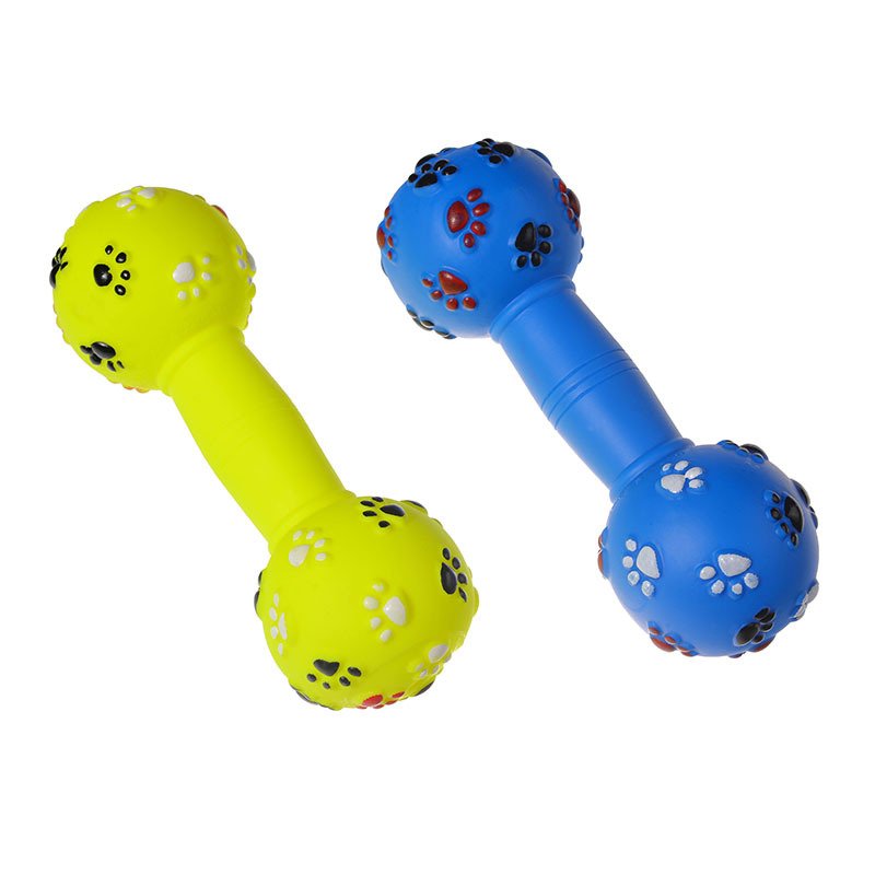 The Rubber Dumbbell Dog Toy is a durable, squeaky chew toy designed for active dogs and puppies.